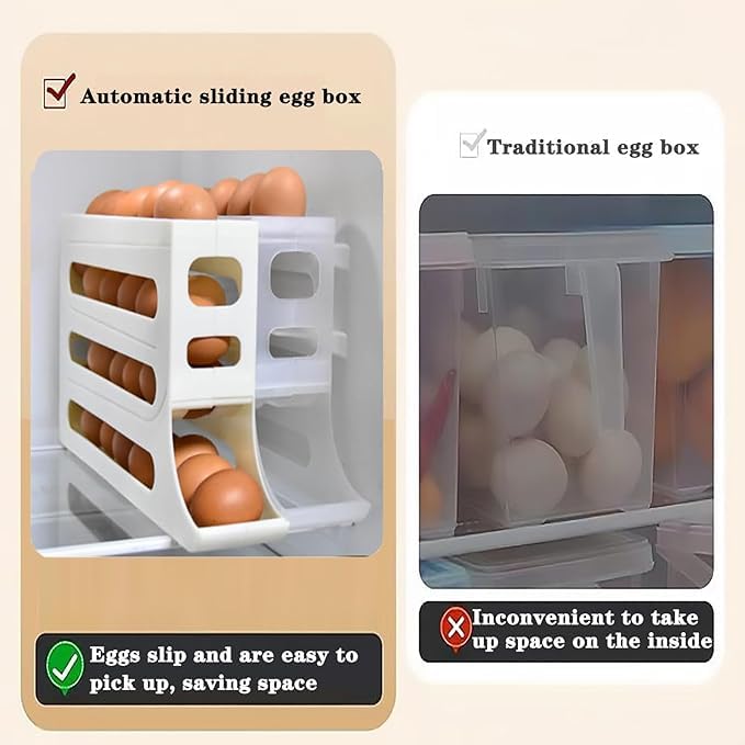 - Hassle-Free Maintenance: Featuring a sturdy, non-slip base, the KRYSNAS egg tray requires no assembly—just place your eggs and enjoy the automatic rolling system that keeps them perfectly organized. Cleaning is quick and easy, ensuring your kitchen stays hygienic and maintenance remains effortless.